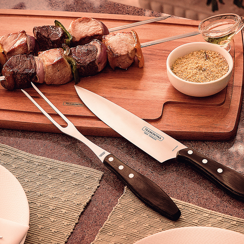 Tramontina's 2-piece stainless steel set with brown Polywood handles.