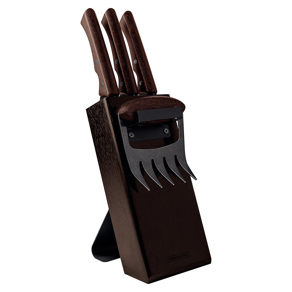 For preparing, cutting, and serving that delicious roast meat, choose the Tramontina Black Churrasco 5-piece barbecue set with stainless-steel blades and wood handles. Consisting of three knives with different functions and a multipurpose claw, it will ensure greater convenience and versatility for your daily routine.