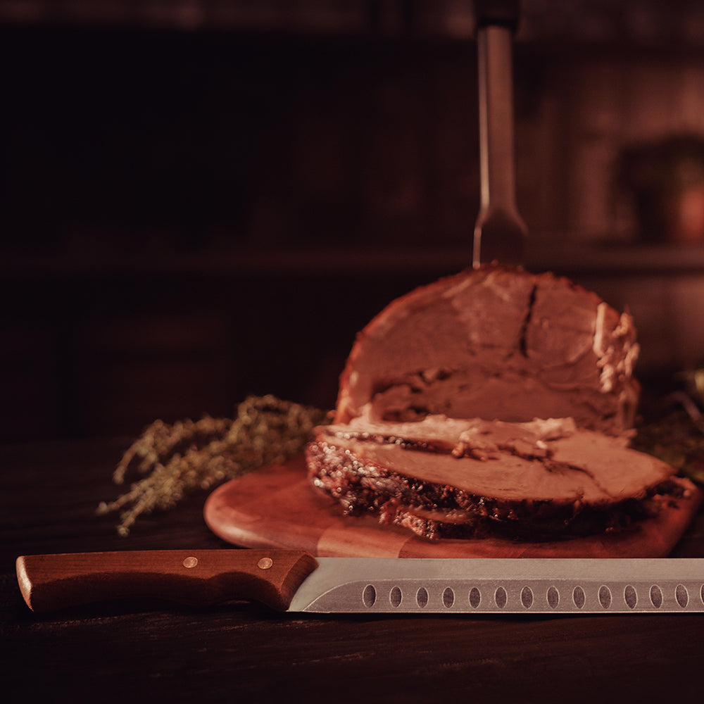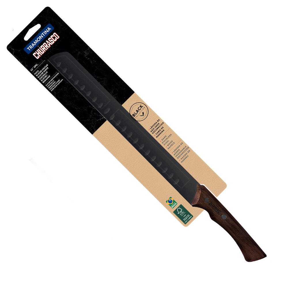 The Tramontina Churrasco Black Brisket Slicer, featuring a 29cm blackened stainless steel blade and a 14.5cm wooden handle with rivets, is the ideal tool for slicing large cuts of meat. Crafted with quality materials, its blade grooves help reduce friction, making cutting smoother and easier.