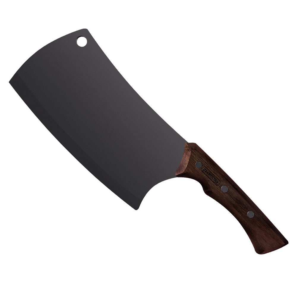 The Tramontina Churrasco Black Meat Cleaver, featuring a blackened stainless steel blade and an 18cm wooden handle with rivets, is designed to assist you in the tough job of cutting through bones and meat.