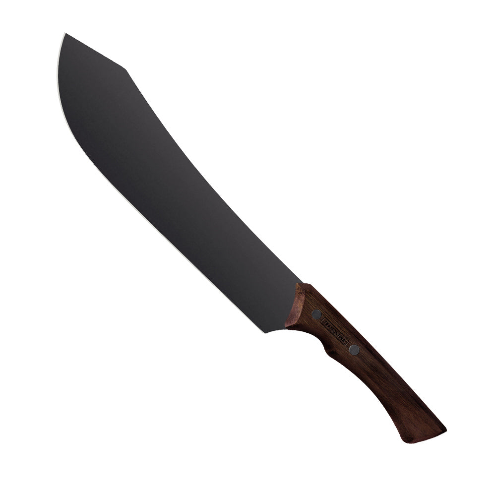 The Tramontina Churrasco Black Meat Knife features a blackened 24cm stainless steel blade and a wooden handle designed for efficient cutting of large meat portions.