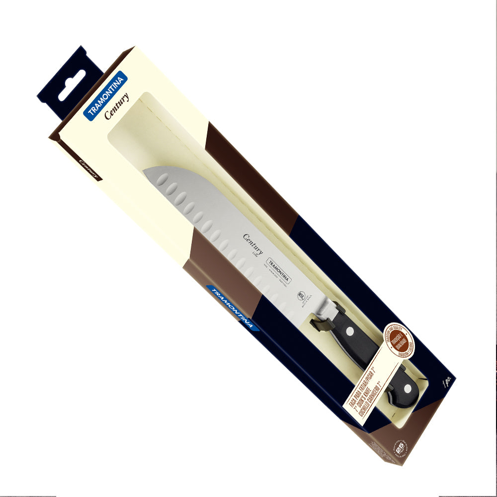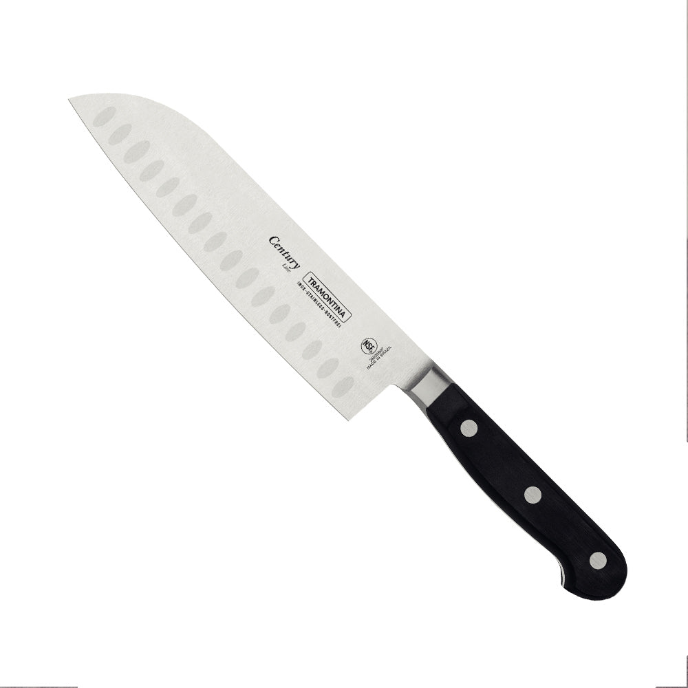 The Tramontina Century 18cm forged Santoku knife, featuring a stainless-steel blade and a black polycarbonate handle reinforced with fiberglass, is a valuable tool for both professional chefs and home cooks.